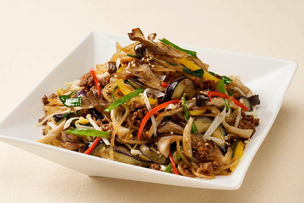 太めのさつまいも春雨に黒毛和牛の旨味と甘めのタレを染み込ませた、ご飯にもぴったりな一品です。豆もやしや人参、ニラ、茄子、きのこなど、たくさんのお野菜と一緒にお楽しみください。